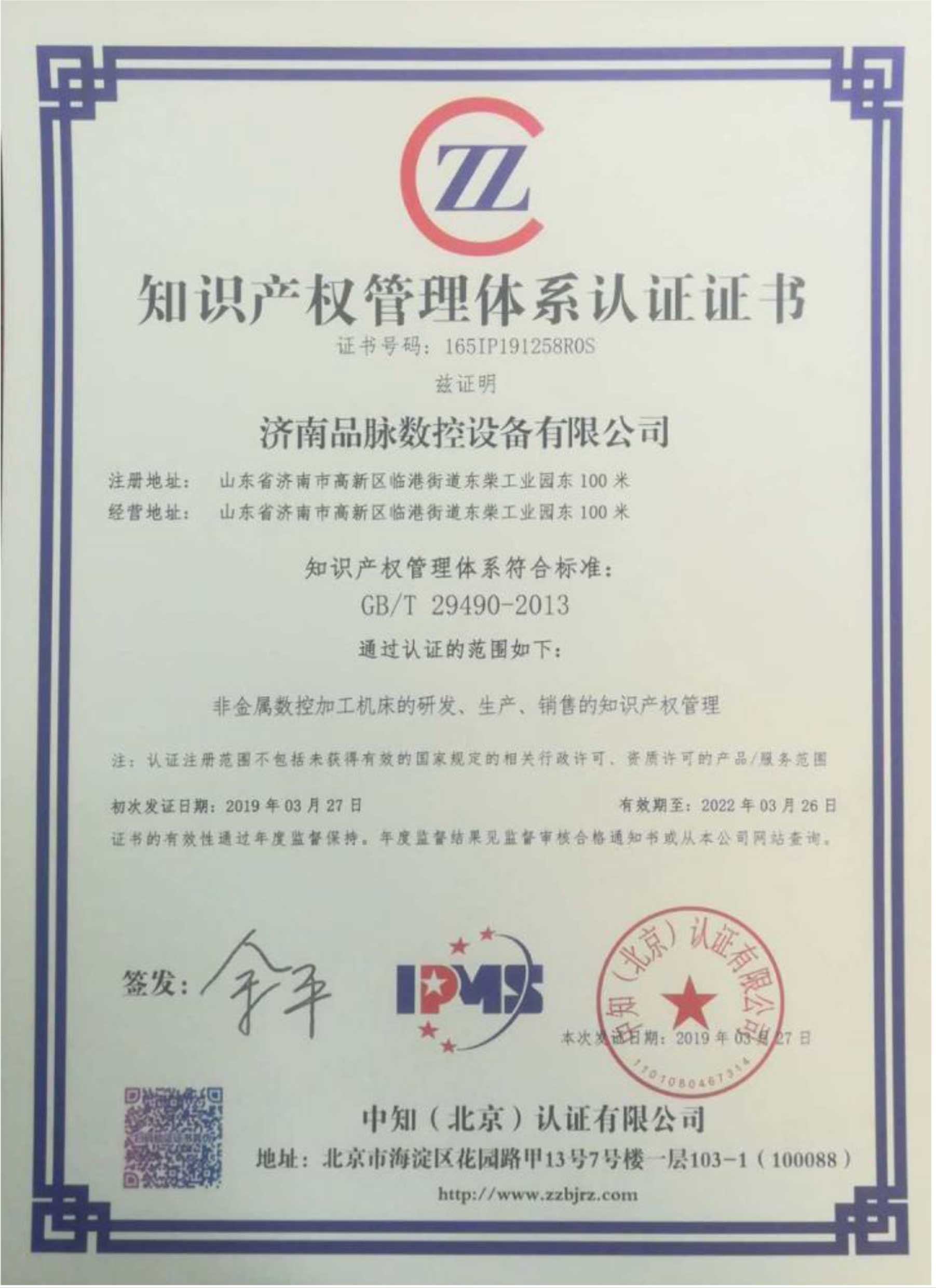 體系認證并榮獲 “知識產(chǎn)權(quán)管理體系認證證書”。證書編號:165IP191258ROS,