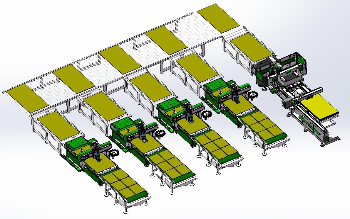 整體的步驟如下:叉車上料--自動(dòng)貼標(biāo)打標(biāo)簽--機(jī)器抓料上臺(tái)面打絞鏈孔、打孔、拉直器槽、玻璃門背面加工--傳輸?shù)椒鍣C(jī)翻板--自動(dòng)傳輸?shù)介T型加工中心--加工門型并切割--加工完推到出料平臺(tái)并同時(shí)上料