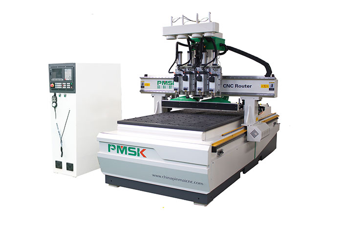 ,機(jī)器機(jī)頭部搭載四個(gè)主軸,在加工櫥柜時(shí)主軸上裝載的刀具分別為6mm,8mm,10mm,15mm.在打孔時(shí)四個(gè)主軸氣動(dòng)切換來(lái)解決所需孔位,在開(kāi)槽和開(kāi)料兩個(gè)裝載6mm刀和8mm刀的主軸進(jìn)行加工,同時(shí)四工序開(kāi)料機(jī)也可以實(shí)現(xiàn)簡(jiǎn)單吸塑門(mén)板造型的加工。四工序