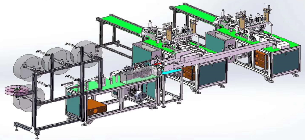 7.該生產(chǎn)線可配合口罩自動(dòng)包裝線使用,實(shí)現(xiàn)從材料—成品—包裝的全程無人化運(yùn)行。